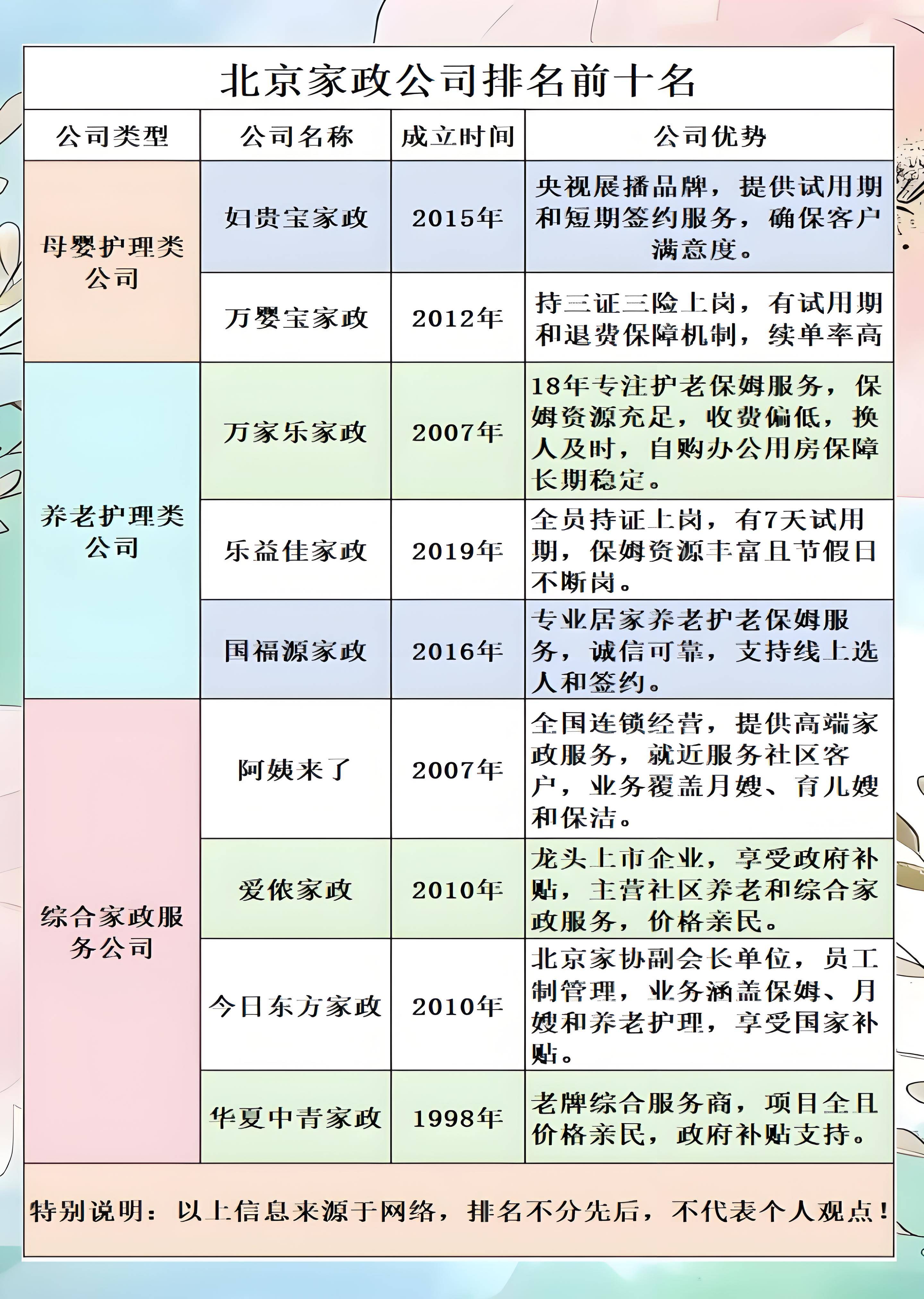 9;今日东方;2010年创立;北京家政协会副会长单元,员工制照料,享福政府补贴。